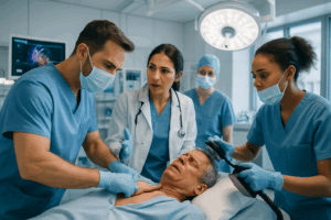 تستخدم مراكزنا أحدث أجهزة التصوير المقطعي ثلاثي الأبعاد (3D CT Scans) والموجات فوق الصوتية عبر المريء (Transesophageal Echocardiography – TEE) لضمان دقة متناهية في اختيار حجم الصمام وموقعه. هذا التقدم يقلل بشكل كبير من المضاعفات، خاصة الحاجة إلى زرع منظم ضربات القلب (Pacemaker) بعد TAVI، وهي إحدى النقاط التي تحسنت بشكل كبير في الإجراءات الحديثة.